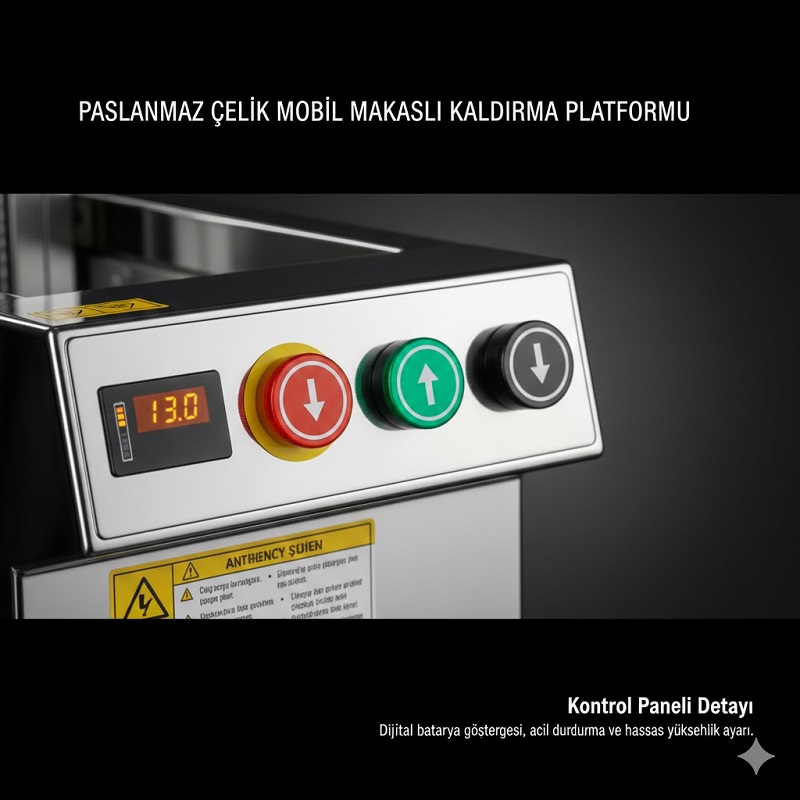 Yukarı–aşağı butonları, acil stop ve şarj/durum göstergeleri ile güvenli kullanım.